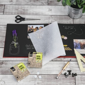 - Adhésif pour coller des photos, des cartes postales, des billets, etc.